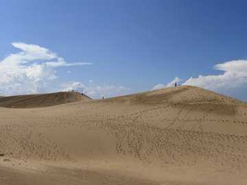 秋気配の都内は26.1度。明日はまた下り坂予報ですが体調管理にご自愛ください。 鳥取砂丘ビジターセンターから~一昨日のグッドショット青空バックの快晴砂丘を超えた,日本海との景色上空には,トビらしき姿も…まだ上昇気流がない様ですが朝方の人影の少ない鳥取砂丘