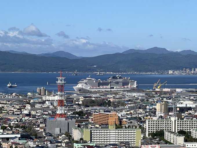 晴れたり曇ったりの28.1度。朝晩の寒暖差にご注意の上で体調管理にご自愛ください。 五稜郭タワーから~青空バックの函館港大型客船・MSCベリッシマが国内ツアーで寄港・停泊中五稜郭タワーの展望室から撮影の1枚でも,船体のスケールは一目瞭然の豪華さです