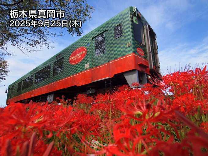 晴れたり曇ったりの29度。天候急変にもご注意の上で体調管理にご自愛ください。 ウェザーニュースのシェア~~明日が彼岸の明けですが…都内近郊は残暑の影響で開花はまばらなヒガンバナ真岡では,線路沿いに満開真岡鉄道・真岡線の1両車両と青空バックの絶景です