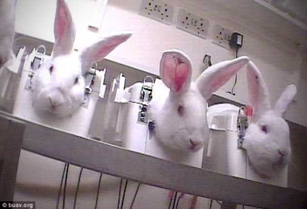 ウサギやモルモットは毛を剃られ、皮膚に試験物質を塗られます。
