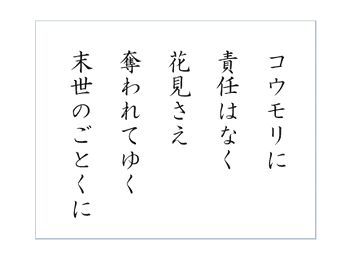 ♪ 一億人の総ひきこもる年度末やよいに満ちるマスクの花々‥‥‥‥‥‥‥‥‥‥‥‥‥‥‥‥‥‥‥‥‥‥‥‥‥‥‥‥‥‥‥‥‥‥‥‥‥♪ 罹患者の一人もいない北朝鮮 国交なきを誇りおるらん♪ 無観客のドームに何も響かざりせめて金属バットに替えて♪ 予防には役に立たぬと知りながら挙るマスクにひとり違和もつ♪ COVID-19(コビッド)やスペイン風邪のトラウマかやけに恐れているが哀しき♪ 重症も死亡の率も低いのにおそれ過ぎとは思わざりしや♪ 突然の休校要請お得意のコントロールをして見せており♪ 安倍リスク日本リスクが株を下げ慌てる様を世界が嗤う♪ 総理こそマスクをすべしその顔の半分見えねばあり難きかな♪ 間抜け面を晒す議会の大臣席ずっとマスクを掛けているべし♪ 出回りしデマ情報に消えてゆく商品棚のトイレットペーパー♪ マスクする人の眼鏡の曇らねばこの暖冬のありがたきかな