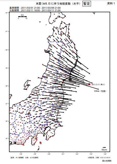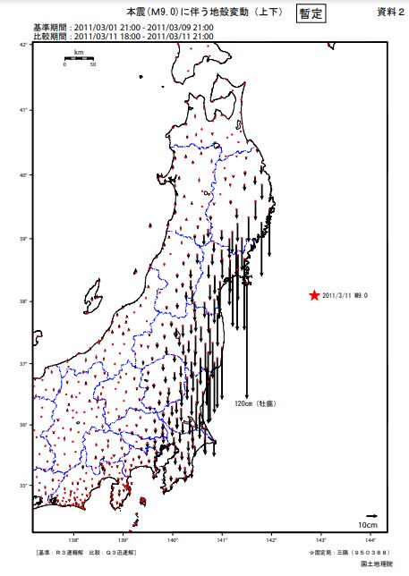 国土地理院が宮城県石巻市に設置した電子基準点「牡鹿」の変動データを新たに解析したところ、地震直後に東南東方向に約5.3m移動し、垂直方向でも約1.2m沈下していたことが分かった。