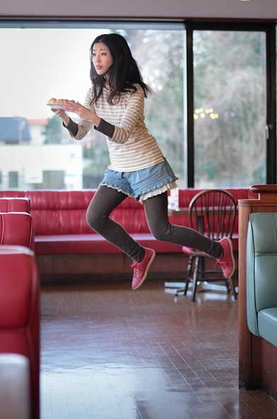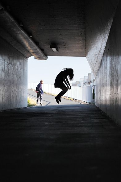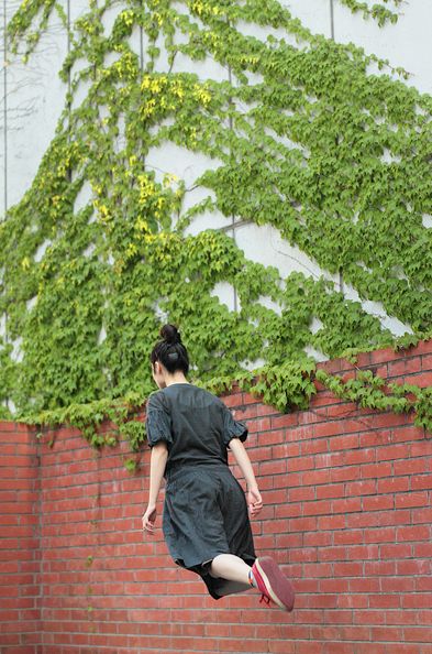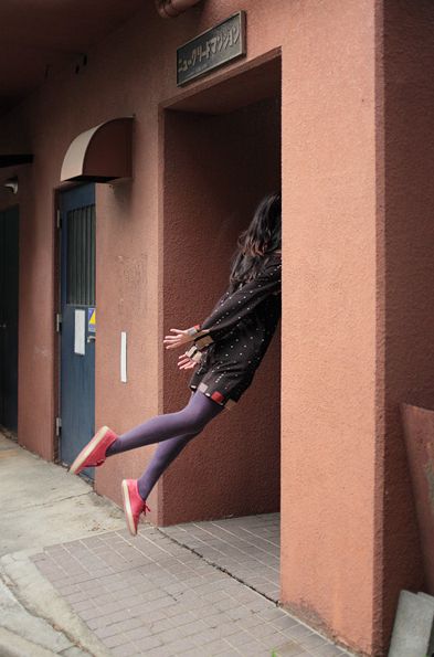 トップの写真はこうしてジャンプして撮ったもの。壁の柄や光の向きで、横でも成立する面白さを現場でデジカメを回して発見したのだそうだ。