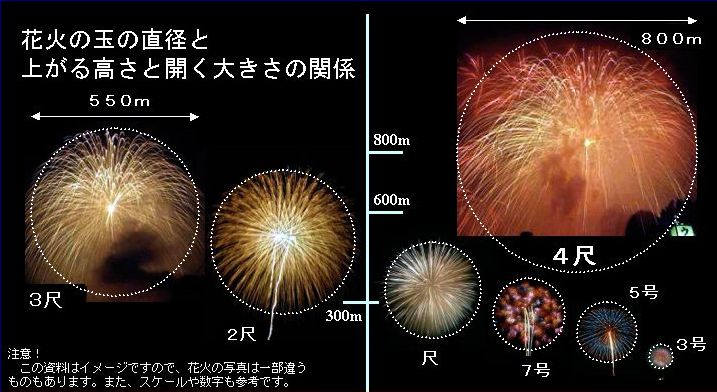 3号玉(開花したときの直径が100mとなる)が4000~5000円、5号玉(開花したときの直径が150m)が1万5000円、7号玉になると3万円~、10号玉(尺玉)で10万円~となる。