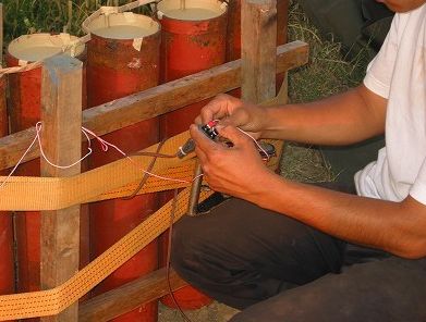 鉄の筒に花火の玉を入れ電気導火線をつなぐ