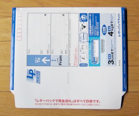 厚さ3cmまで、重さ4kgまでならOKなのでこういうものを送るのにはとても便利だ。普通郵便と同じようにポストに投函できるのも有り難い。
