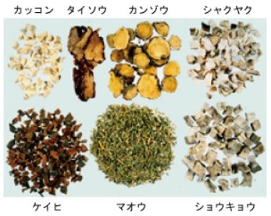 【配合生薬】葛根(カッコン) →解熱・鎮痛作用、筋弛緩作用。麻黄(マオウ) →発汗・解熱・鎮咳作用。大棗(タイソウ) →滋養強壮、鎮静作用。桂皮(ケイヒ) →発汗作用、水分代謝調節。芍薬(シャクヤク) →鎮痛・抗炎症作用。甘草(カンゾウ) →生薬の調和。生姜(ショウキョウ) →健胃作用