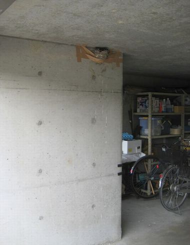 このガムテープに家族の愛が滲んでいる。手の届きそうな高さの駐車場の天井は危険がいっぱいだが、何とかここまで無事に育ったのだ。もう少しで巣立ちの時が来る。その日までは家族がガードマンを務めるのだろう。