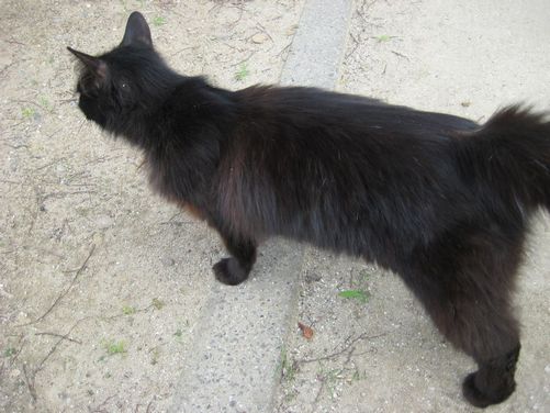 毛が長く尻尾も立派で大きい真っ黒な猫を、ウォーキング途中のおやじさんが長い事撫でていた。近づくと、こっちへやって来て体を摺り寄せて来る。撫でてみて分かったが、がりがりに痩せている。野良猫らしいが、ずいぶん人馴れしている。