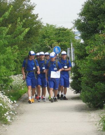 大同特殊鋼の社員が オリエンテーリング で、東海市から歩いて 「佐布里緑と花のふれあい公園」 へ向かう途中。梅林のあるこの公園を拠点にコースが設けてあるらしい。5-6人のチームで地図を持って歩き、タイムを競いながら社員相互の親睦と協調精神を養う。