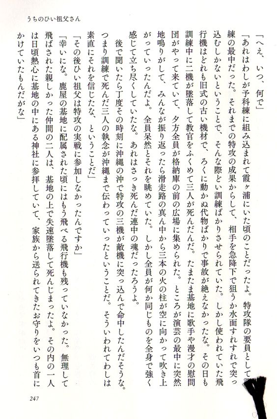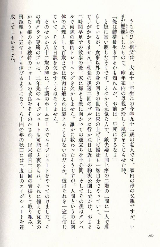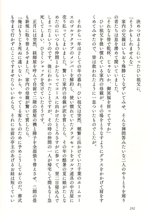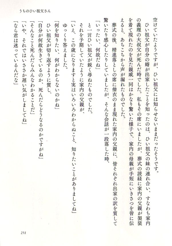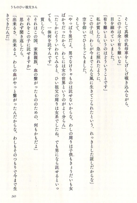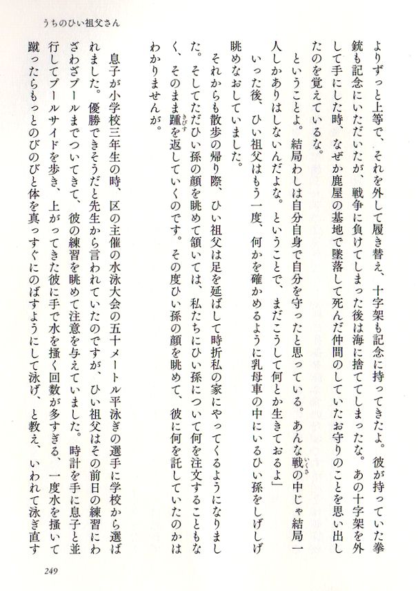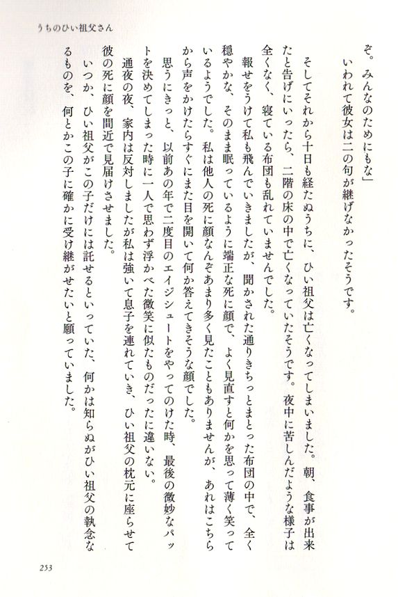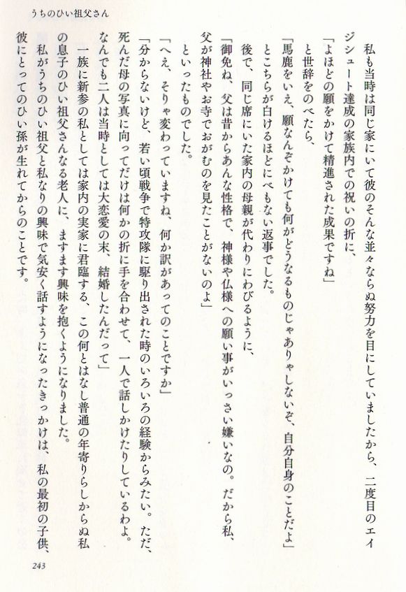 この本の最後を飾る「うちのひい祖父さん」がこれがとてもいい。大正11年生まれの92歳の老人、奥さんの母の父親の話なのだが、こんなお祖父さんになりたいものだと思って読んだ。もう遅いと言われそうだが、死をどう捉えるかという部分で私の思いとフィットする。
