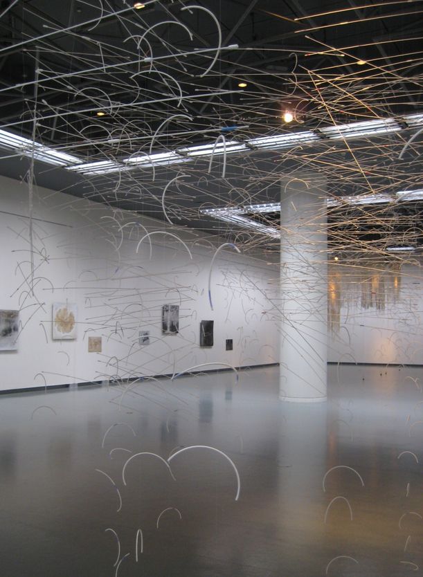 G室の良いところは、天井の吊り下げ躯体が昇降トラスで電動で上下できること。天井の高さ4.9m(他の部屋は5.8m)を利用して、空間を利用する大きな作品展示にはとても都合がいい。展示されている作品は、そんな利点を最大限に活かしたものが特徴だ。