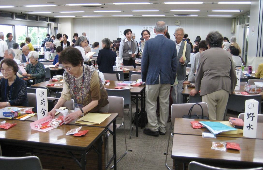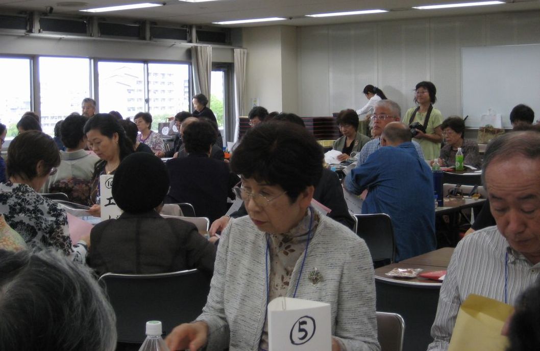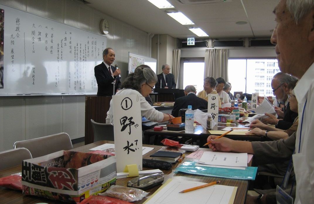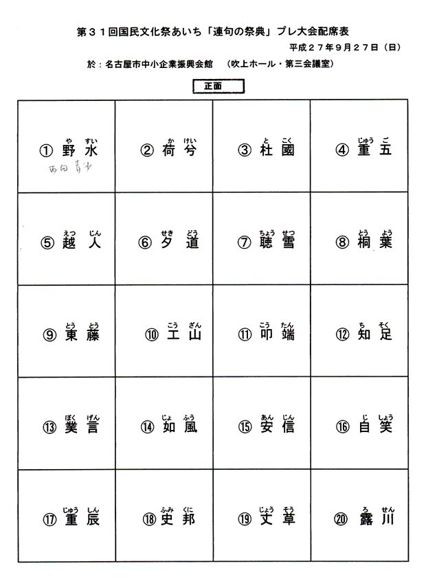 プレ大会だし、連歌というものの話題は普段あまり聞いいたことがないので、こじんまりした会なのかと思っていたが、行ってみて驚いた。大きな部屋一杯に机が並び、4つのテーブルごとに名前が付けられていてその数何と20番まであった。
