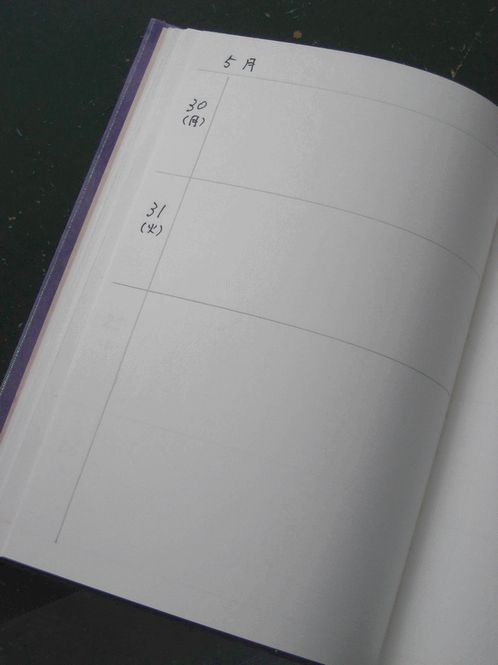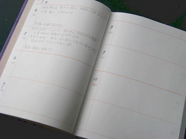 日曜日が月始めなる月(5月)、土曜日が月始めになる月(10月)、金曜日が月始めとなる月(1月、4月、7月)とか、6週ある月(1月、7月、10月)があったりして、無駄な部分と不足の部分(白紙の見開きでカバー)が出来たがそれも愛嬌。