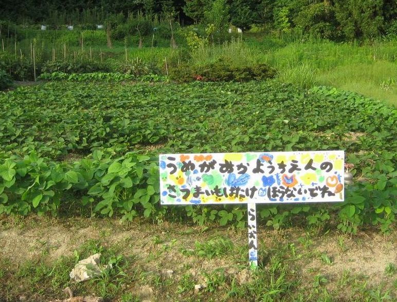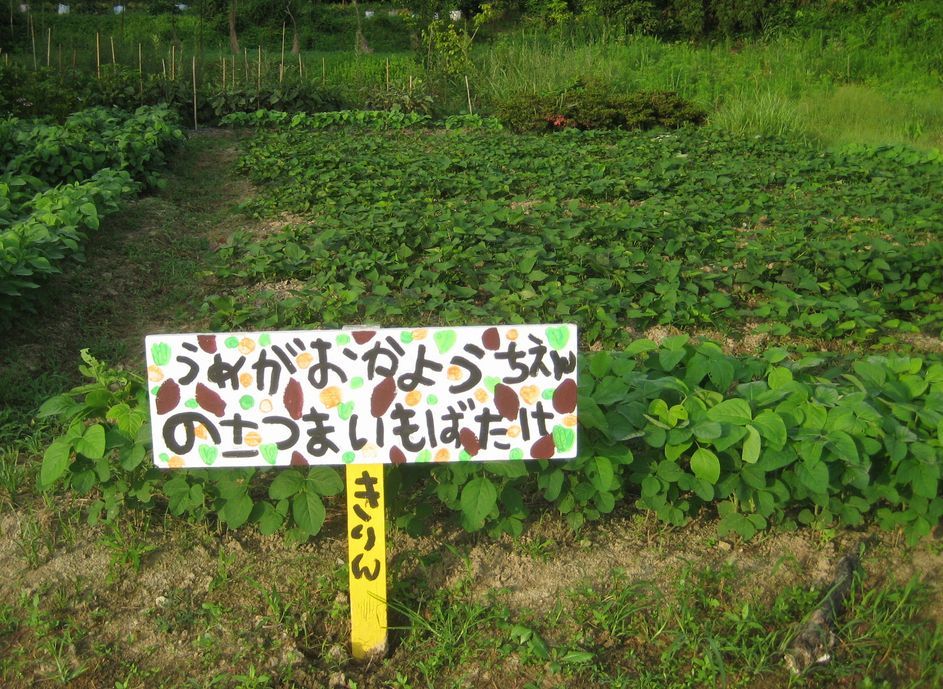 毎年、幼稚園のイモ畑に立つ札。一枚の畑だが、「きりん」と「らいおん」の名が付いた二本が個性を出していて楽しい。