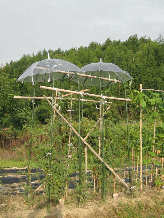今年も健在だったミニトマトの雨傘。毎年やっているところを見るとそこそこの効果があるのだろう。雨に弱い品種なのかも知れない。