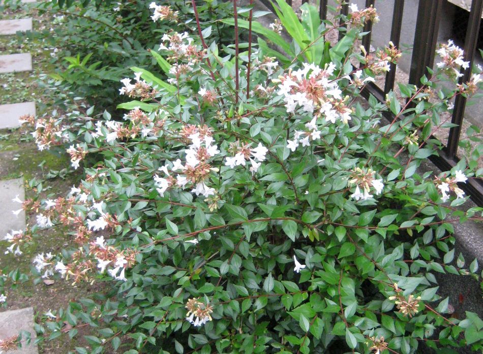 わが家のアベリアは白。別名をツクバネウツギ(ハナゾノウクバネウツギ)と言い、漢字では「衝羽根空木」と書く。これはウツギに似た姿で、プロペラのように広がる5枚の萼が花後も残って、羽根つきの羽根のように見えることから付いた名だとか。