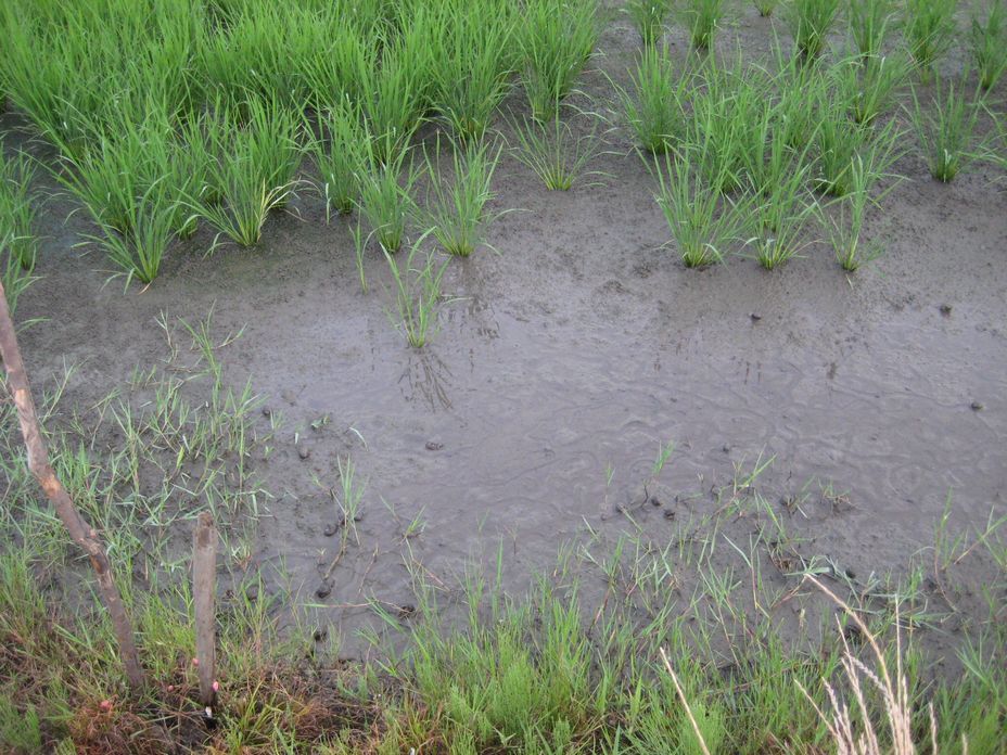 こちらは別の田んぼだが、ここもやたらにジャンボタニシがいる。植えたばかりの苗を食べてしまうので歯抜け状態になっている。