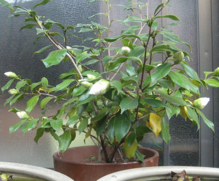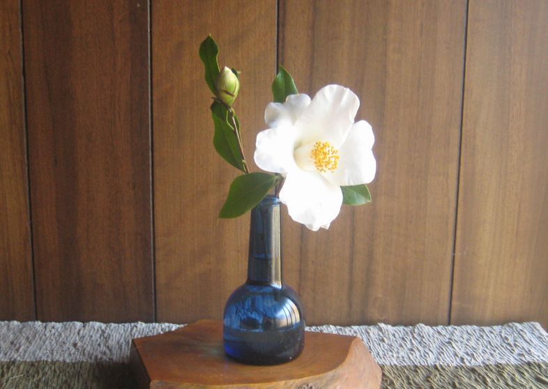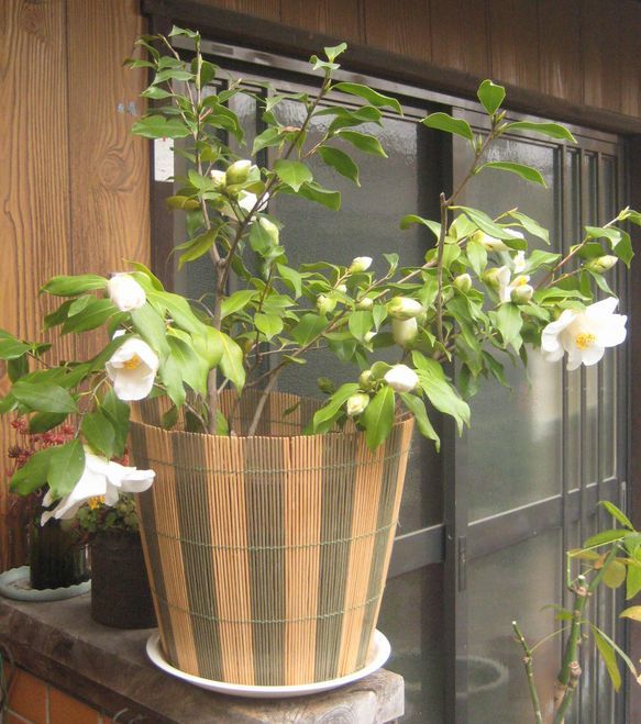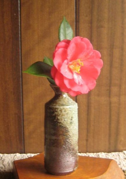 こっちは赤薮椿。少し小振りの花だ。こう開いてくると小さくても八重咲はけっこう饒舌な感じがする。椿はやはり半開きぐらいの時が一番かわいく美しい。ここまで開き切ると、内奥の秘密の恥部を晒している様で美しさは半減する。〇☆〇秋のいけばな展 2025.10.27