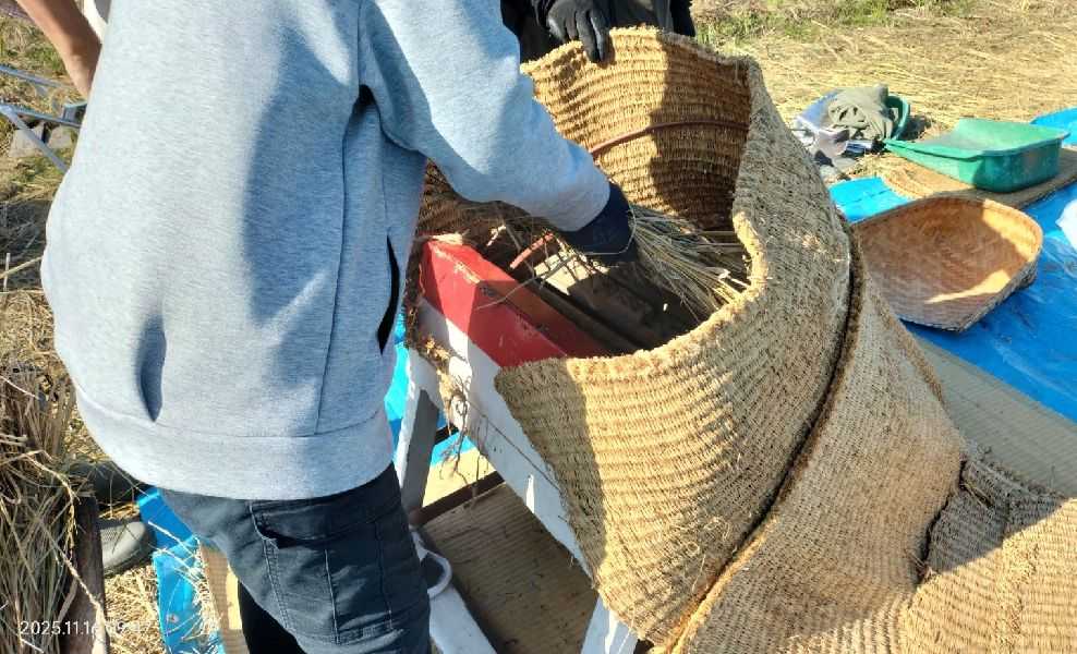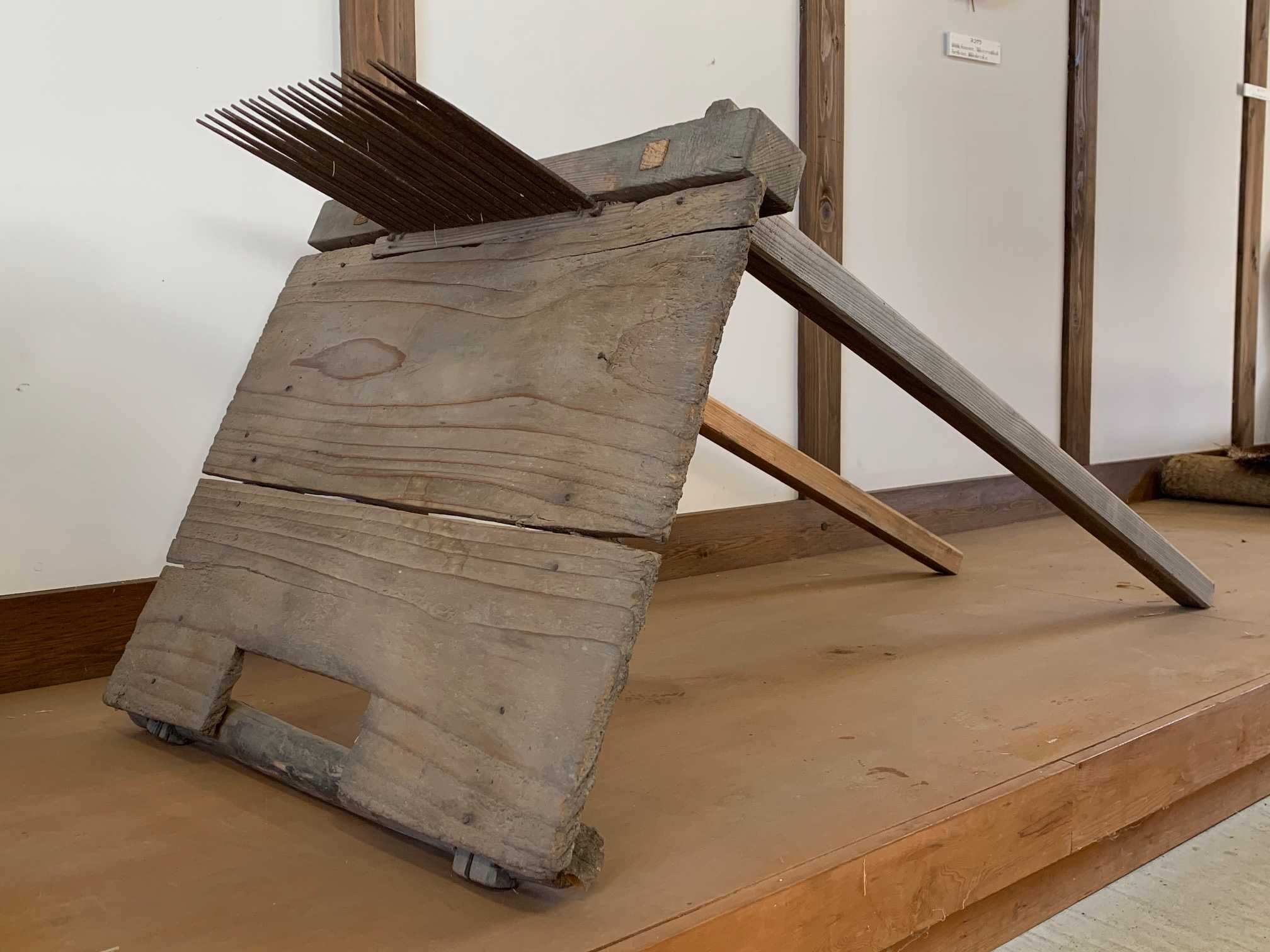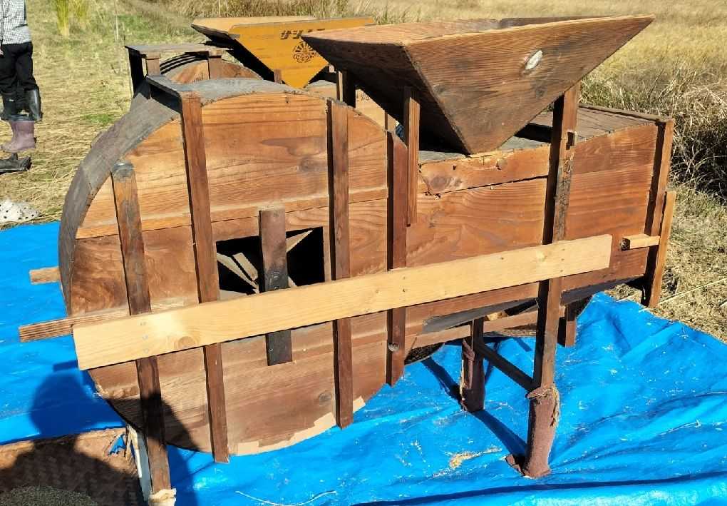 左:足踏み脱穀機 右:脱穀した中の細かいごみを吹き飛ばす唐箕 (とうみ) レトロな世界がまだちゃんと生きている。