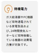 つまり、 「インターネットのルーター、PC、スマホの充電、ドライヤー、アイロンなどなど」細かく種類が多すぎて分類出来ないものが、ぜーんぶこの「待機電力」に含まれている ということらしい。分かったような分らないような答えだった。