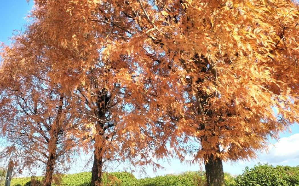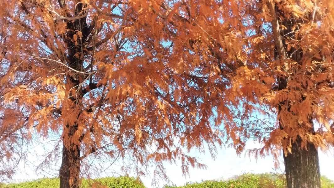メタセコイアの紅葉は遠目にもよく目立つ。