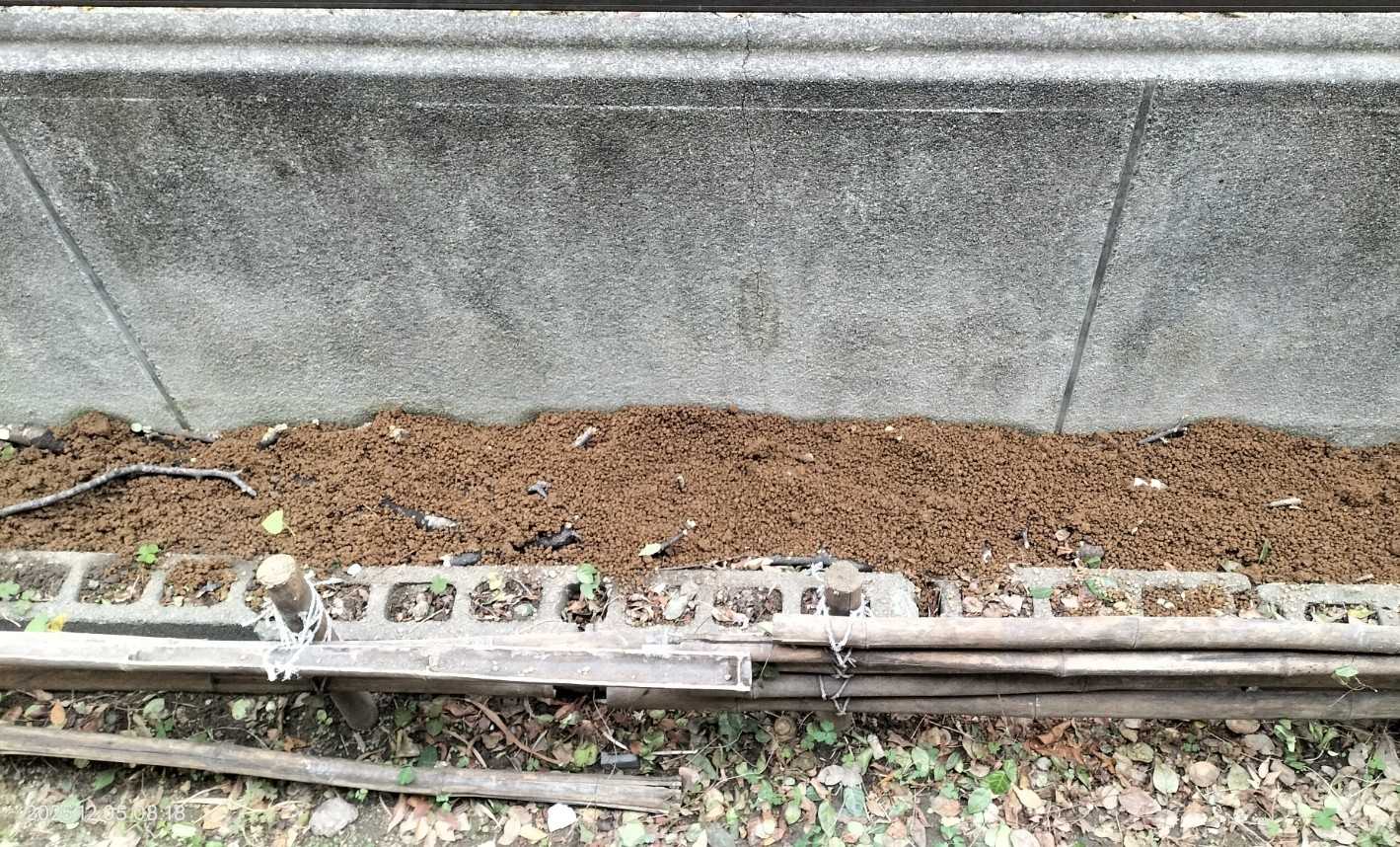 先日、アベリアとキンシバイを撤去したところを土壌改良しようと、「菌ちゃん」の土作りを真似てみた。枯れ枝を入れ、メダカの鉢に入れてあった赤玉土(捨てるのは勿体ない)を被せてやった。そのままでは栄養素が足りないかもしれないので、枯葉を乗せてマルチングする。