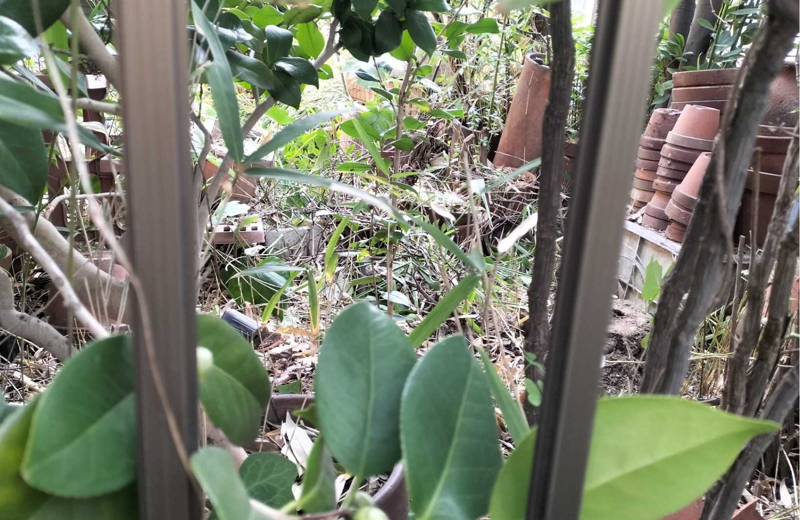 庭へ行ってみると植木鉢やらプランターやらが積み上げてあり、篠竹などが繁茂して足の踏み場もない。片づけながら草を刈り、なんとか少し見通せるようになった。