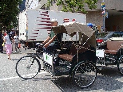 「シンガポール旅行記2010.10」の続きです。☆★☆2010/10/02 (SAT) 2日目☆★☆ランチの後は免税店で解散し、半日市内観光終了。ここからは、トライショーに乗って街めぐりをするというオプショナルツアーに参加します!トライショーとは、サイドカーをつけた自転車のことです。 昔は庶民の足だったようですが、今ではすっかり観光客向け。しかも最新型という感じで、とても新しくてキレイなトライショーでした。トライショーに乗り込んだら、約45分間の旅が始まります~。このように、日本人観光客を乗せたトライショーはずらり並んで、普通に車道を走る!走る!!結構、スリルがありますよ(笑) 途中、運転手のおじさんが片言の日本語で説明をしてくれます♪「インド人街!」とか「オカマちゃんロード!」とか。おじさん、暑いけど頑張って~! このトライショー、観光客に合わせて音楽も流れます。でも、流れる音楽が「川の流れのように」や「長崎は今日も雨だった」等、なつメロばかりでウケました(笑)トライショーでの観光だと、通常の観光では行きにくい、小さな路地にも入ることができます。午前中の半日市内観光よりも、ディープなシンガポールを味わうことができる感じ。 ◆リトル・インディア◆ ◆スリ・ビーラマカリアマン寺院◆ ◆泥棒市場◆ 今回のシンガポール旅行で一番印象に残ったのが、トライショーでの街めぐりでした。約45分間と長時間、快適なトライショーで観光できるのでオススメですよ♪次回は、シンガポールのアメ横!ブギス・ストリート編でーす☆ 応援(1クリック)お願いします♪
