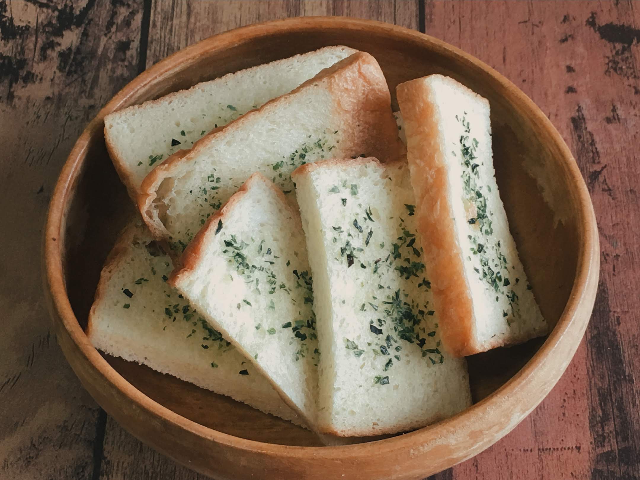 乾燥させたパンに溶かしバターとすりおろしたにんにくを混ぜたものを塗ってオーブントースターで140度で10分焼きました。