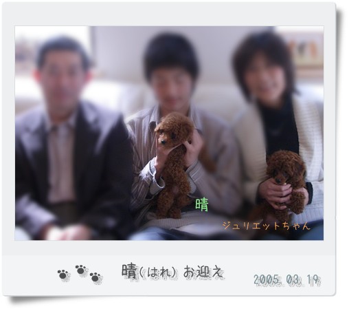 我が家のPCには、「はやく出たいよ~」と、言っている Photo子ちゃんが、たぁんまりδ(~Δ~;)そう! 久しぶりの会合や、素敵な出逢いが あった この数日(*^.^*)ですが・・・もうしばし してからの ご報告となることを お許しくださいませ。m(__)m今日、3月19日は *晴記念日*晴(はれ)が 我が家にやって来て 4年になりました。新しい家族 と、ママ(チェリーちゃん)と 妹(ジュリエットちゃん)と、 命を取り上げ いつくしんでくれた家族。群を大切にする 晴ちんだから、、、別れは とても 辛かっただろうね。連れて帰る道すがら、、、なんだか無理やり誘拐したみたいな気持ちで、、、晴が とても かわいそうに 思えました。初めての夜は、疲れたのか? すんなり寝てくれたけど、 2日目の夜は、ひとりになると、「キャンキャン」鳴いて・・ついには、 「ウォーン!ウォーン!」 と、遠吠え・・・抱き癖がつくのは、よくないかな?? と、廊下からこっそり 見ていたけど・・たまらなくなって、ケージから出し、壁にもたれて座ったまま 晴をダッコして寝たね。 今では、ふつーに ダッコでネンネです (^^ゞその翌日からは、ごはんも食べず、、吐いたりして、、、とても心配で、ぷりままに 電話で相談もしたよ。先に お里を出た弟の アルくんも そうだったって、チューブの栄養剤を届けられたそうです。ぷりままの アドバイスを 実行するも、、、わんこ初めての 私の心配性は マックスになっていて、結局 獣医さんに行ったね。兄2(にぃに)の 高校の合格発表の結果をメールで 受け取ったのは、獣医さんの待合室でした。(≧m≦)そうして、数日は 獣医さんからもらった ブドウ糖液を、数時間ごとに飲んでてんね。そんな・・・晴にとっては・・・・大きな 壁を 乗り越えて、晴は、正真正銘 うちの子に なりました。 初めて ヘソ天で リラックスな寝んねを 見せてくれた時は、嬉しかった~兄1(アニチ)くんとも 仲良く ネンネ テスト勉強にも お付き合い ^m^晴ちゅん、好きだよ~晴が パピーの頃から 好きだった 場所おにーちゃんの 足の間 お尻の上今も 大好きな 場所 だね~ (≧∇≦)うちの子に なってくれて、 ありがとぉ これからも すっとずっと 一緒だよ。