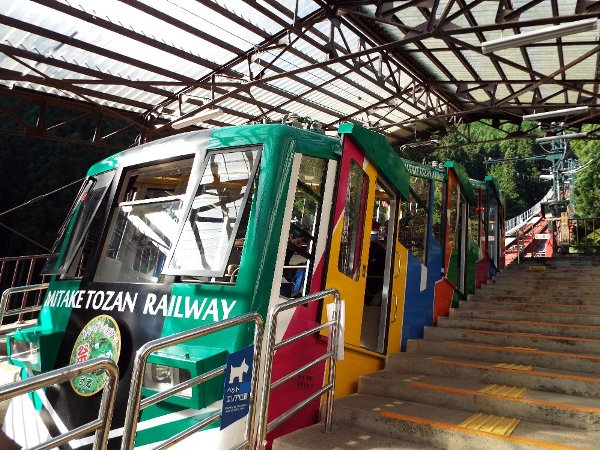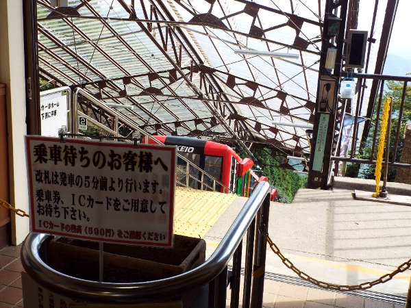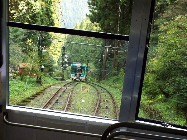 有料駐車場の目の前がケーブルカー・滝本駅なので、往復乗車券を購入してケーブルカーに乗り込む。