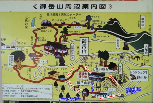 休憩がてら15分ほど待っても一向に営業する気配がないので、周りを見渡したら案内看板があったので、眺めるとケーブルカー駅まで徒歩で下りられそうだった。