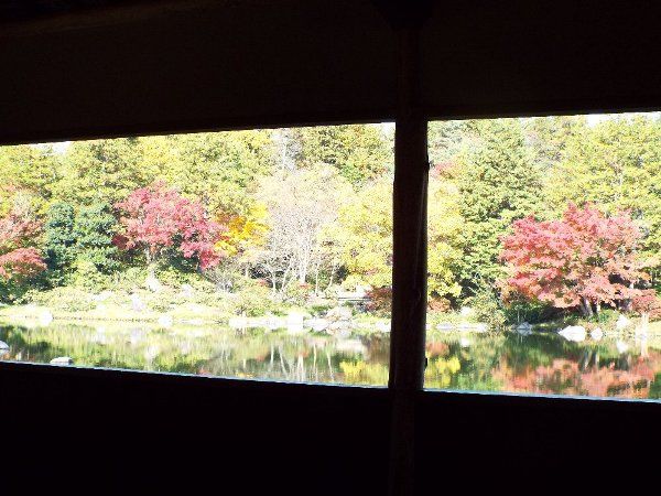休憩所【昌陽】の窓越しの紅葉風景