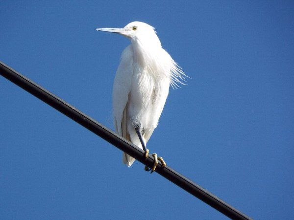 カワセミの出没する山王中グランド前の親水公園に向かう途中、頭上の電線に【コサギ】が居た。これも随分久し振りのご対面で嬉しくなった。
