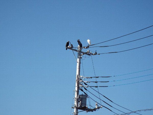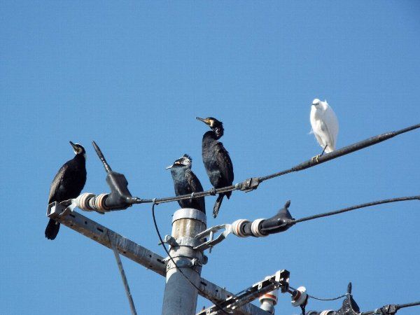 更に自宅に近づいた所、往きしなに見掛けた【カワウ】が居た電柱に何と【コサギ】が一緒に止まっているではないか・・・・