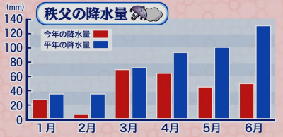 今年の秩父地方の月間降水量を纏めると次図のように例年よりも少なく推移していて、特に五月、六月は例年の半分程度と少ない上に七月も少雨傾向なので、荒川水系では水不足が懸念される。