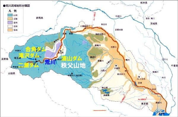 しかし、一方の【荒川水系】は主に秩父市周辺の【浦山ダム】、【二瀬ダム】、【滝沢ダム】、【合角(かっかく)ダム】の四つしかなく、しかも流域面積が狭い。