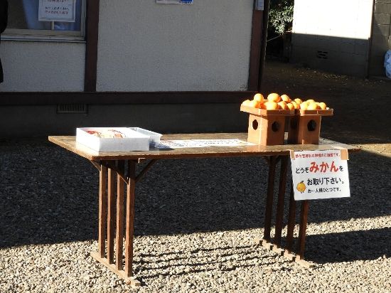 甘酒をご馳走になって振り返ると通路を挟んだ真後ろの机の上に段ボールに入った絵馬と、三宝の上にみかんがあってどちらも無料と書いてあった。