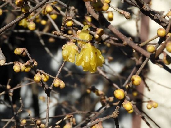 初詣をした氏社の一の鳥居を出た社務所の裏庭に【蝋梅(ロウバイ)】が咲いていた。