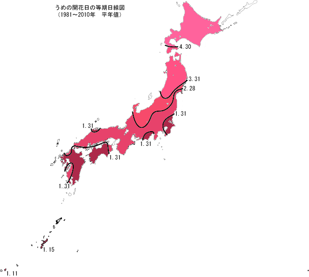 下図も気象庁の資料だが、1981年~2010年に於ける【梅の平均開花日】を現したものである。