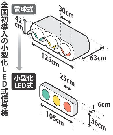 この新しい小型信号機は、警察庁が新しく開発した車両用の小型の発光ダイオード(LED)式で、2017年6月大阪市鶴見区の交差点に全国で初めて設置した。