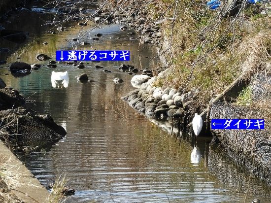 【ダイサギ】のすぐ近くには【コサギ】も居たので【大・小】そろい踏みを撮影しようと構えたらコサギが尻を向けて逃げ、20~30m先の水域に着水した。