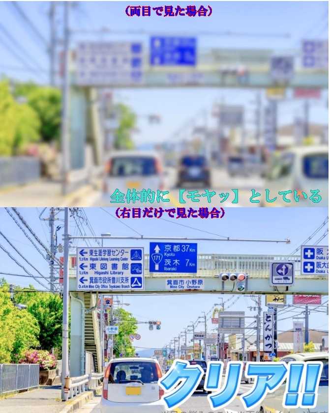 現在は、硝子体内部が混濁した状態なので、全体的に【濃い霧の中】の中に居るようで下記のような感じだ。