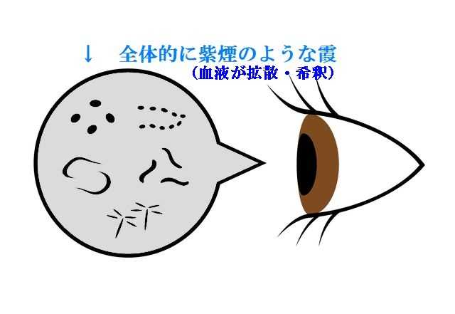 概ねの傾向として、出血量は毎回微量と思われるが、出血直後は血液が濃いので【ごま状、虫状、蛙の卵状、糸くず状、煙草の煙状】などの模様が確認されるが、直ぐに希釈・拡散されて【硝子体】全体が混濁して【タバコの煙状】になる。