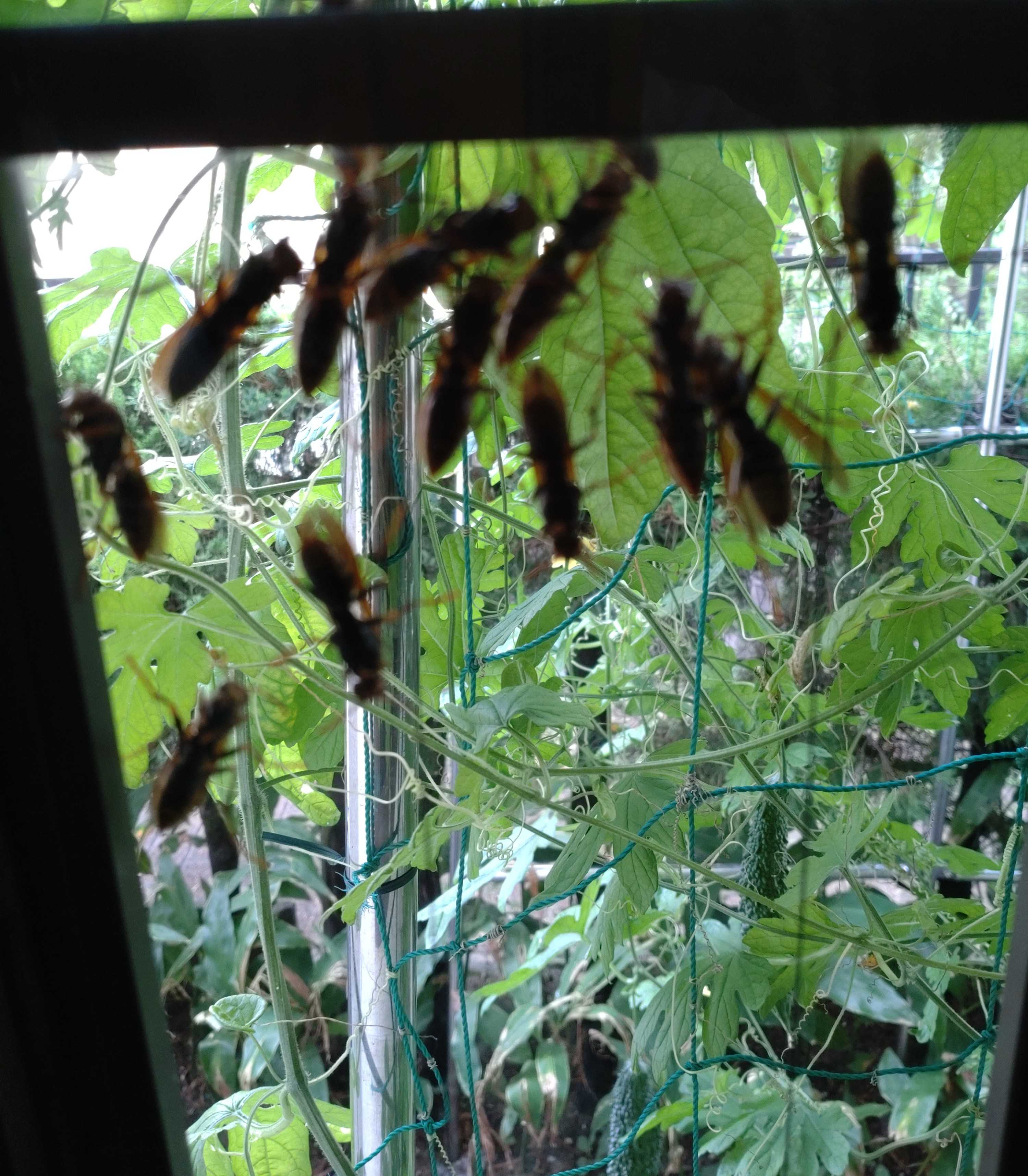 まだまだ気温が高いです!体操教室です。お掃除お当番で早く出かけました。若い方欠席ですから頑張らねば…と思ってモップかけ始めたら “80歳以上は、しないで良いってよ!” 私”そんな言ってたら準備のお掃除する人いなくなるでしょう” 時々勝手な方がいます!!もう一名の若い方 頑張られました。すみませんです。体操は 無理にならない程度動かせるだけしてみました。午後から鍼灸医院へ 夫の内科とダブりましたので便乗早めに行きましたら、「良いですよ」で治療していただきました 夕飯時です。窓から見えるゴーヤのカーテン お盆前に枯れそうになりました。なぜか?返り咲き実が付き始めまして~ 喜んでいるところへ蜂2匹 ほろ酔いの夫「ありがとう」 姿見えなくなりましたところに セミがお休みしてました。明日元気に鳴くことでしょう!私も返り咲できますように…