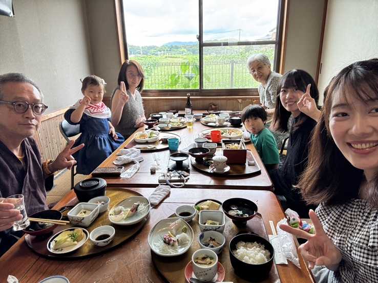 今日も又早起きです。少々眠たいですが気候が良くなったから?起きれました。お謡の会へ行く夫送り出して、家事少々 【国宝】残り少ないので読みながら、迎えに来てくれる孫・娘待ちます。9月生まれのお誕生会 ひ孫が参加されるお店選んで集まりました。男孫欠席ですから、変りは父親(娘婿さんです)お料理は 好きなもの選びました! 私は色々食べれる定食へ、これに揚げ物付きです。曾孫は、お先に失礼とばかりに… 盛りだくさんのお子様ランチを…余談ですが、ひ孫見ると私の祖母が「女は笑顔 七難隠す」と言っていた事思い出します。お顔はおすすめできませんが笑顔が良くて~かわいい子ですから~お隣のお部屋も 「お誕生会」らしい話声 出口でお逢いしたら、やはり4世代のようです。世の中変わりました! ケーキで祝うお誕生会とは違いますが… 楽しい語らいです長生きはしてみるものです💛