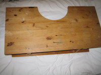 ぶうは、二分脊椎でも脊椎の障害を受けているところがL2~1と高めだったので、座位をとるのに、安定させる必要がありました。リハビリでは、腰周りを囲むような専用のテーブルがありましたが、自宅では…。そこで、おとうが手作りしました。ホームセンターで90×45cmの板の真ん中を、直径30cmで半円くりぬいてもらいました。そこに足をトントンがんがん打ちつけて、高さ30cmで仕上げました。これは、ぶうが幼児用のいすに座ってちょうど良いように、と計った高さです。 写真は、左が上から見たところ、右が下の足の部分です。ぶうはこの机で、食事したりおもちゃで遊んだり、涙のひらがな練習をしたり、大活躍でした。ホームセンターで、簡単に半円取ってもらえるし、材質が「木」だし、おとう自慢の手作りの逸品です(^^)v。