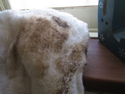 いやいや、すごい嵐でしたねー。昨日は、夜中までもゴーーーっと風が吹き荒れて家も揺れるようでした。車のヘッドライトの光の筋に細かな土の粒子が激しい風に流れていくのが見えて、本当に「ブリザード」でした・・・。一夜明けて、さらさらした土がうっすら町を覆って、ここは砂漠のオアシスタウンです。そして、その細かな粒子は鍵をしっかり閉めてあるサッシからもサラサラサラサラ侵入していました・・・。気づけば家中土ぼこりをかぶってる!!! 悲しい!朝からもう大掃除のように掃除機かけて床も窓枠も棚も拭き掃除の一日でした。外も郵便受けは砂受けになってるし玄関は吹きだまりだし・・・。近所からもホースで洗い流す音が聞こえてきます。もうぞうきんもこの通り、一拭きで「土」です。いつも季節の変わり目は大風が吹くけど、昨日の強さと時間の長さは厳しかった・・・。そして、「春一番」の後は真冬カムバック。寒い~。まあ、三寒四温、いやでも春に、そして蒸し蒸しの夏になるんですが、なんか激しい季節の振れにやられてしまいます。