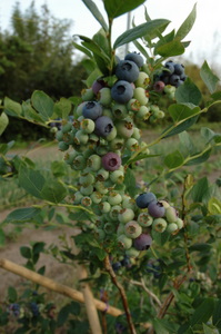 義姉のところでは、ブルーベリーにはまっていて、収穫のお誘い。「とにかく採りきれないのー」というので、よっしゃと出かけて、4,5本の木に向かって、うちと姪や甥、大人4人で採っては食べ採っては食べ・・・。 ブルーベリーの実の多さは恐るべし。4人総力あげて立ち向かっても、見た目変わらず。 そして後から後から「行くわよー」と色づく気配。 おなかいっぱい食べて、タッパー一つぶんさらにもらって帰りました。 これでもまだベビーの木だそうで、大人になったらどうなるんだろう。夢は道の駅に出荷?かな。